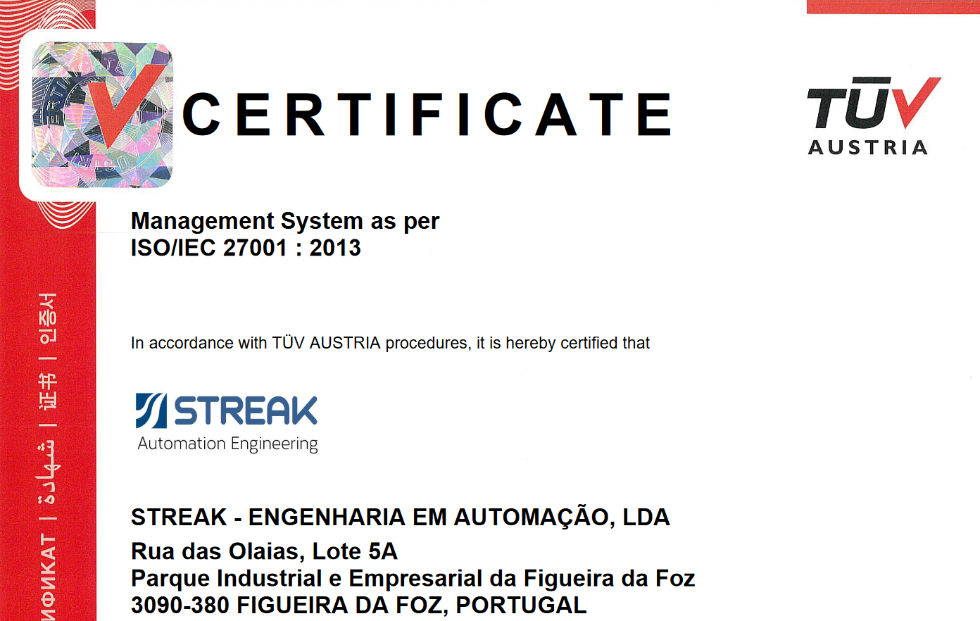 A STREAK – Engenharia em Automação congratula-se pela certificação segundo a Norma EN ISO 27001:2013 que tem por base os procedimentos da TUV.